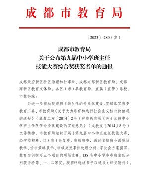 为深入落实“立德树人”的根本任务,加强班主任队伍建设,提高班主任的专业能力和教育智慧,促进班主任素质和工作能力的提高,更好地发挥班主任在学校思想道德建设中的作用,2023年10月19日,由成都市教育科学研究院主办,崇州市教育教学研究培训中心、七一实验小学承办的“成都市第九届中小学班主任技能大赛小学二组决赛(原南片区)”在崇州市七一实验小学举行。来自温江区、双流区、邛崃市、崇州市、新津区、大邑县、蒲江区等7个参赛区市县的8位选手同台竞技。我校郭婷老师代表双流区以总分第一的成绩获得特等奖。