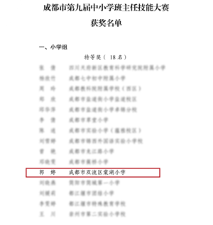 众人划桨开大船,从区赛到市赛,历时几个月紧张而艰辛的准备。郭婷老师的表现赢得评委专家和老师们的一致好评,最终获得了成都市班主任技能大赛“特等奖”的优异成绩。参赛路上,双流区教科院小学德育教研员段旭老师深入指导,学校杨柳书记给予了郭婷老师关心和大力支持,雷朝丽副书记带领着德育处以及强大的棠小班主任团队集思广益,凝聚共识。宝剑锋从磨砺出,郭婷老师日夜坚持,力求卓越,才有了此次傲人的成绩。