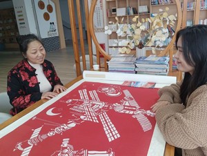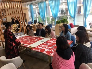 剪纸课堂结束后,王明坤老师与学校美术老师进行了深入的交流和探讨。她将自己的剪纸经验倾囊相授,老师们也格外珍惜这次来之不易的机会,纷纷向王老师提出自己在教学中所产生的疑问。最后王老师将自己创作的剪纸作品分享给大家,详细阐述了自己创作思路,老师们受益匪浅。