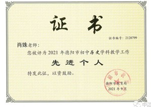肖姝,中共党员,德阳市历史学科先进个人,中江县师德标兵、优秀班主任、历史学科先进教师,中江县历史学科优秀教师。