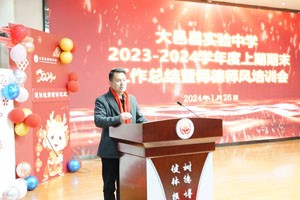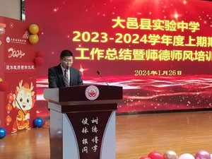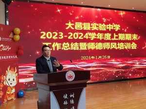 总结经验,展望未来,为更好践行《大邑教育高质量发展三年行动计划》,2024年1月26日下午,大邑县实验中学全体教职工齐聚学术厅开展2023-2024学年度下期期末总结暨师德师风培训,党政办副主任王倾臣主持会议。
