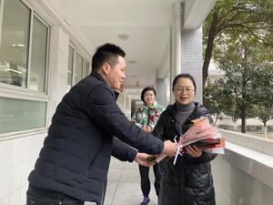 3月8日清晨,学校党支部书记、校长刘进军,工会主席罗德松带领学生志愿者在校门口向女教职员工们送上最亲切的节日祝福。
