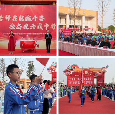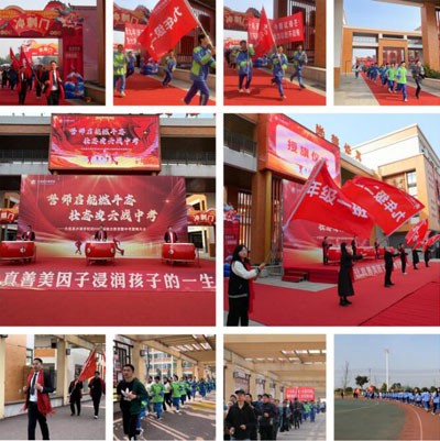 学校党支部书记、校长刘进军、学校专职副书记母义甫为五个班级授旗。接过指向胜利的旗帜,班主任们握紧旗杆,坚定眼神,充满豪情壮志地挥动起来。此刻,战鼓擂起来了,七八年级师生的加油助威声响起来了,九年级的同学们热血沸腾起来了!紧跟刘校长的步伐,九年级的师生和家长在阳光下赛场冲刺、逐梦未来!