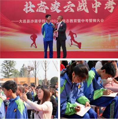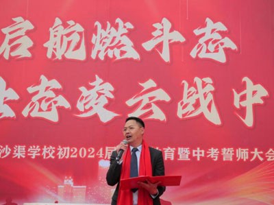 “江碧鸟逾白,山青花欲燃。”在这个春回大地、万物竞发的时节,为了进一步激发九年级师生备战的豪情壮志,增强迎战中考的信心,3月22日沙渠学校召开了初2024届励志教育暨中考誓师大会。沙渠街道办副主任陈牧月、大邑县教育局德艺体室主任牟滟、沙渠企业家协会会长徐东、沙渠公益事业促进会会长周志梭、沙渠街道社区卫生服务中心党支部书记肖腾翼、沙渠派出所教导员张勇、沙渠企业家协会秘书长王兰刚、沙渠街道各社区党委书记等一行人与沙渠学校党支部书记、校长刘进军、全体行政人员、初中部全体师生及家长代表们参加了大会。