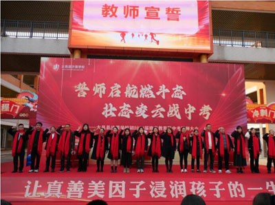 学校专职副书记母义甫带领九年级全体教师,铿锵有力地庄严宣誓。