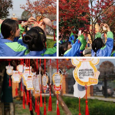九年级的同学们,在小小的卡片上,记下心中大大的梦想,悬挂在桂花树枝头,寓意“蟾宫折桂占鳌头,金榜提名喜登科。”