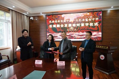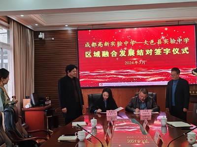 庚即,与会领导共同见证了两校区域融合发展结对签字仪式的圣神时刻,大邑县实验中学校长张家智和成都高新实验中学校长刘楠分别代表学校在协议书签字,标志着两校融合发展正式起航。随后与会领导、教师合影留念。