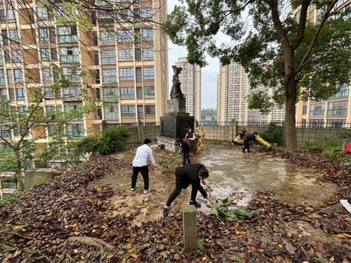 来到烈士纪念碑前,党员教师带头对烈士纪念碑附近的枯枝落叶进行了全面清扫,擦拭了纪念碑上的灰尘。