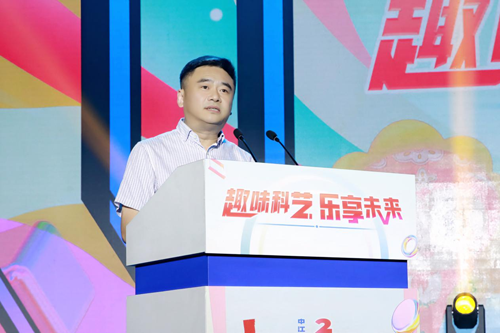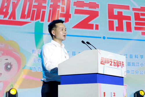 中江县人民政府副县长刘福兴讲话。他指出:近年来,县委县政府始终把教育放在优先发展的战略地位,聚力抓投入、优布局、促均衡,不断增加教育投入,全面推进中江教育高质量发展。同时,全面落实“五育并举,立德树人”根本任务,高度重视学生的全面发展,不断培养学生的科学精神、创新精神,今天孩子们的精彩展示,就是最好的诠释。他希望:通过今天的活动,能够进一步激发孩子们对科学和艺术的热爱与兴趣,培养孩子们的创新能力、实践能力,充分挖掘学生特长、促进学生全面发展,在体育、美育、艺术等领域取得更多的成果,打造五育融合发展的中江教育特色。