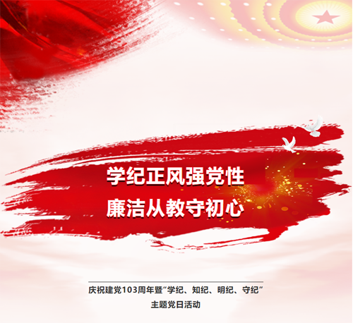 为热烈庆祝中国共产党成立103周年,强化党员干部的纪律意识,坚定理想信念,引导全体党员坚守初心、践行使命,以清正廉洁之风为学校发展保驾护航。7月12日,四川省大邑中学全体党员在大美楼学术厅举行“学纪、知纪、明纪、守纪”的主题教育活动。