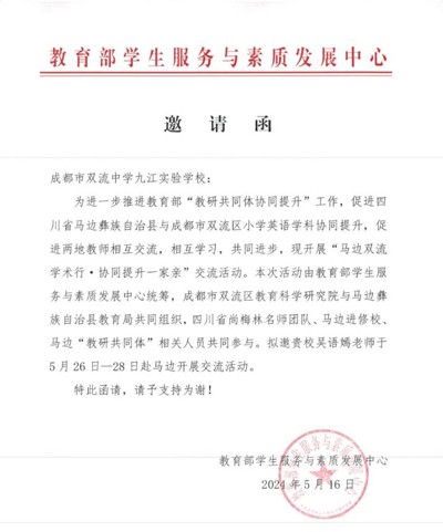党和国家重视教育,重视义务教育均衡发展。党的二十大更是强调了教育是国之大计、党之大计。教育部教研共同体协同提升项目将在教育部学生服务与素质发展中心的组织与统筹下,在各方支持与配合下持续推进与深入发展。双流中学九江实验学校也将在国家政策的引领下,继续致力于“乡村振兴”工程,为推动义务教育优质资源均衡发展和乡村教育高质量发展献出绵薄之力。(双流中学九江实验学校)