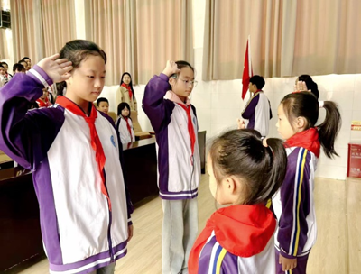 星星火炬,代代相传。伴随着《红领巾飘起来》的悠扬旋律,六年级的少先队员代表为新队员佩戴红领巾、互敬队礼。红领巾象征着荣耀的传奇,蕴含着光荣的传递,寄托着深深的嘱托,更承载着无限期望。