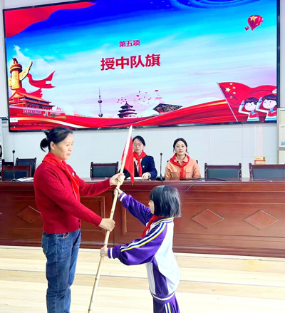 接着,辅导员冯霞老师为中队授旗,新队员手接中队旗,表达肩负新使命的决心。