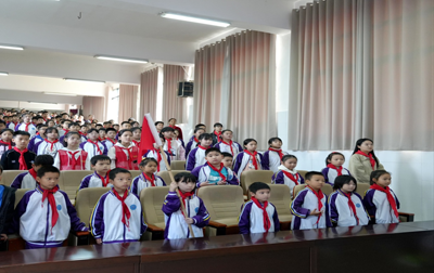 在雄壮有力的《少先队出旗曲》伴奏下,拉开了少先队员入队序幕。大队旗手和护旗手迈着坚定的步伐走向会场。
