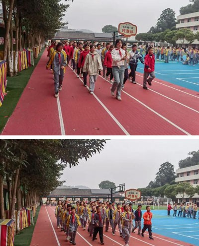 学校将运动会作为班级和年级展现特色、展示风采的舞台,各班级入场方阵百花齐放,阳光在跑道上洒下斑驳的影子,整齐划一的方阵宛如一幅幅流动的画卷。