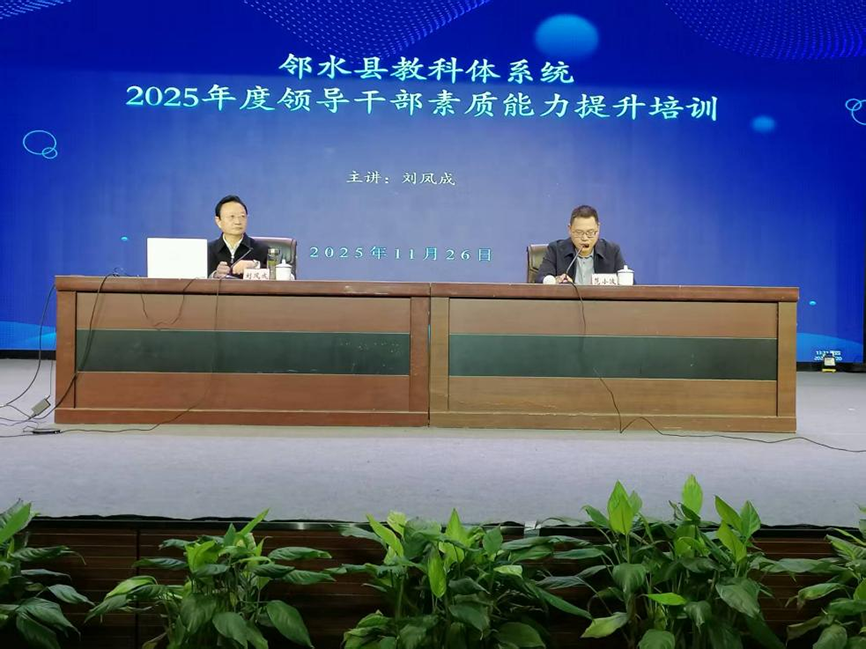 次日下午,邻水县教科体系统 2025 年度领导干部素质能力提升培训接续开讲。培训由县教科体局局长范小波主持,采用 “主会场 + 分会场” 联动模式:县教科体局机关及直属单位全体干部职工、全县各校(园)党组织书记与校(园)长、城北及城南责任区副校级干部在第六小学演播厅主会场参训;各责任区督学组长、其余校(园)副校级干部及中层干部在各分会场同步学习,实现县域教育管理干部培训全覆盖。