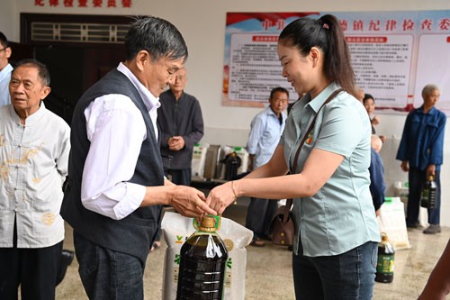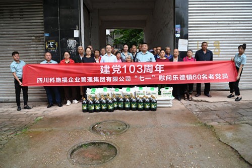 “今年是中国共产党成立103周年,‘七一’即将来临,四川科施福农业科技有限公司特意来慰问我们曾经作出过贡献的老党员们,为您们每人送来了一袋大米和一桶菜籽油,我代表党委政府感谢‘科施福’党支部和公司全体员工。”慰问品发放现场,该镇党组织负责人这样对老党员们这样说。