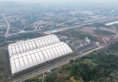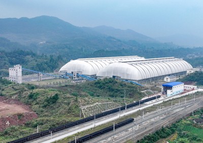 2024年11月11日,鸟瞰正式投入运行的四川省首个国家级储配煤基地广安华蓥市高兴储配煤基地翻车机房。(邱海鹰 刘南贤)