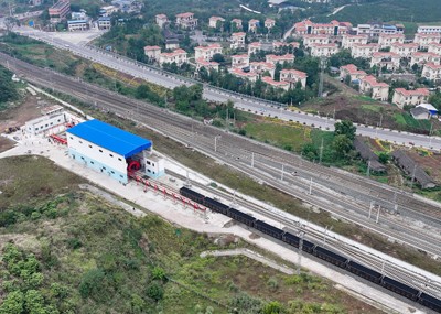 2024年11月11日,从陕西蒲石入川的首列运煤专列,停靠在四川省首个国家级储配煤基地广安华蓥市高兴储配煤基地翻车机房前等待卸载。