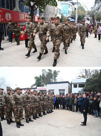 “一二三四!”这铿锵的口号,进入小镇时,就立即引来沿途群众举起手机拍照;离开小镇时,又一阵“一二三四”洪亮的空号声,引来了群众自发目送和鼓掌声!(记者蒋兵)