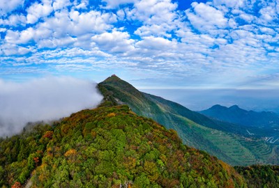 2024年11月10日,色彩斑斓的四川省广安市华蓥山在蓝天白云和阳光映衬下,宛如人间仙境。