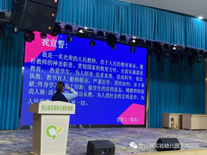 “我是一名光荣的人民教师,忠于人民的教育事业,履行教师的神圣职责、贯彻国家的教育方针,全面实施素质教育。热爱学生,为人师表;追求真理,崇尚科学; 依法执教,教书育人;勤勉敬业,严谨治学; 团结协作,乐于奉献;终身学习,勇于创新; 做学生的良师益友,铸教师的高尚人格;淡泊名利,廉洁从教,为人类社会的文明进步,为人民的教育事业奉献一切”,在李汶丽老师的带领下,全园教职工进行了庄严的宣誓。