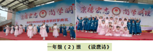 一首唐诗承载一段历史,一段舞蹈叙说一个故事。一年级(2)班的孩子们带来了舞蹈《读唐诗》。宛转悠扬的音乐响起,伴着轻柔的节拍,他们跳动轻快的脚步, 挥洒舒放的手臂,绽放灿烂的笑容,散发着少年的朝气,诠释着梦想的魅力。一群活泼可爱的孩子带领我们在舞蹈中寻找先人的文明与足迹。