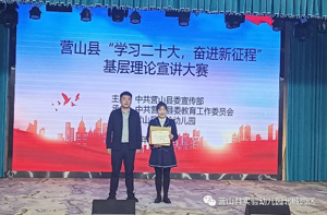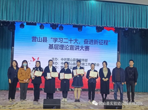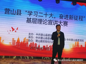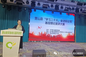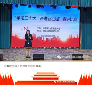 抖擞精神开新篇,奋楫笃行正当时。为持续深入学习宣传党的二十大精神,贯彻落实国家教育方针政策,增强教师立德树人、教书育人的责任感。2023年3月10日上午,营山县县委宣传部在营山县实验幼儿园?开展了以《学习二十大? 奋进新征程》为主题的基层理论宣讲大赛,全县共8名幼儿老师参加了宣讲,其中,营山县实验幼儿园有5名老师参加。