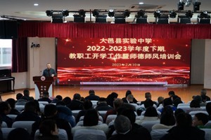 未雨绸缪,科学筹划,展望未来,树立信心。2月10日下午,大邑县实验中学在学术厅召开2022-2023学年度下期教职工开学工作暨师德师风培训会,全体教职工参加。党政办主任蒋林主持会议。