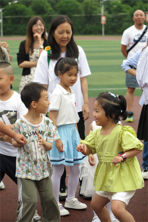 上午的活动主要为团辅类,包括萝卜蹲、大风吹、桃花朵朵开等游戏。现在,我们往这边瞧瞧,几个小组在一起一蹲间已闹闹热热了起来,原来大小朋友在玩“萝卜蹲”。“白萝卜蹲,白萝卜蹲,白卜蹲完红萝卜蹲。”大、小朋友们一边麻溜蹲起一边小心念着,一边提防自己失误一边又盼望对手犯错。一轮轮转下来,免不了有“倒霉蛋儿”笑着被淘汰。