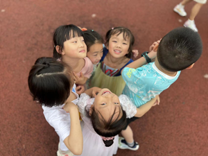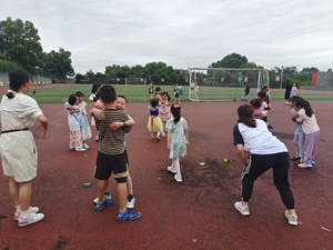 今天虽是暴雨打头阵,但咱们体验的却是“大风吹”。当大朋友指挥孩子们围圈、站定,说着“大风吹”,孩子们则积极回答并精准定位被大风“吹到”的小伙伴,他们或蹦蹦跳跳互换位置,或静若处子待在原地,迅捷而精准地做出了自己的选择。