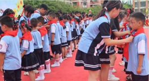 为表达对出席活动领导的欢迎和感谢,优秀少先队员代表学校敬献属于他们的光荣——红领巾。
