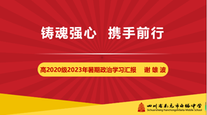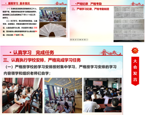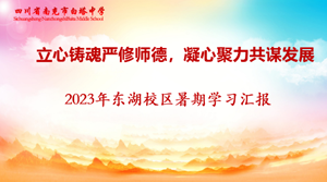 学校组织开展暑期学习要求严格,时间紧凑,内容丰富,形式多样;东湖校区教师积极参与,学有所得,收获满满。大家一致表示,在学校党委和行政的坚强领导下,将始终坚持以忠诚担当的政治品格铸就信仰之魂,以忠于职守的职业品性培育国之根基,以忠于人民的教育初心固护民之根本,以忠于教育的奉献精神坚守师之要义,坚定信心,团结一致,坚决完成“百年白中,再续辉煌”三年行动计划,实现创建引领性一级示范校的伟大目标!(四川省南充市白塔中学)