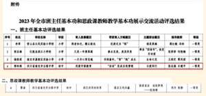 在2023年南充市中小学班主任基本功和思政课教师基本功大赛中,四川省南充市白塔中学郭玲筠老师荣获“班主任基本功”一等奖;黎涵老师荣获“思政课教师教学基本功”一等奖。