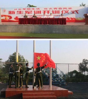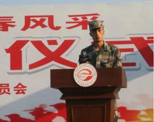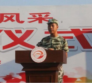 新生代表周震同学作表态发言,他号召同学们要认真参训,迎难而上不退缩,要服从命令听从指挥,刻苦训练磨砺意志。