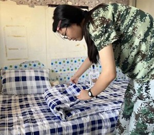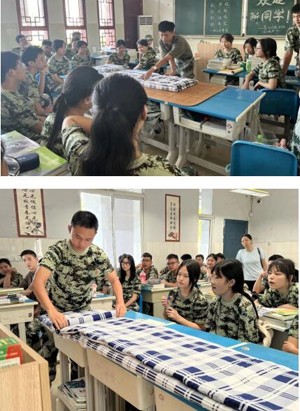 “豆腐块”怎么叠?这是内务整理的重头戏,这时,轮到教官们上阵了!同学们目不转睛,紧盯教官用肘平铺、整塑直角、压实提紧,瞧着一番演示,而后再一通操练。终于,同学们在一次次实操上手后把看似简单却不容易的叠军被学了个“七分熟”。