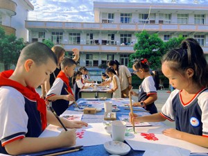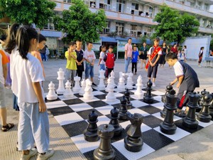 越过长长的红毯,映入眼帘的是由一棵大树组成的心愿墙,孩子们迫不及待地拿起笔,许下自己的心愿,贴在高高的枝丫上。一名刚粘贴好心愿的孩子向前跑去,跟随他的身影,看到了操场中央摆放的大棋盘,原来国象比赛正在如火如荼的进行。再向旁边看去,老师正在指导学生挥洒笔墨,体验国画的乐趣。