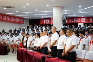 全体同学在少先队大队辅导员马洁老师的带领下,向鲜艳的五星红旗庄严宣誓:寸土虽窄,皆用鲜血守卫,中华梦宽,团结铸就奋发。安不忘危,治不忘乱,存不忘亡。岁月无疆,英雄不朽,勿忘国殇,吾辈自强!勿忘国耻,强我中华!铿锵誓言,掷地有声!