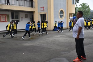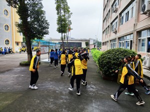 默哀仪式完毕后,伴随着后续防空警报铃声的响起,防控演练活动接续开展。一声令下,全校师生按照既有疏散路线,迅速、有序的到操场指定地点集合。演练活动按计划,有组织的进行着。