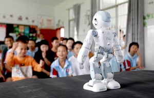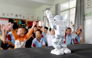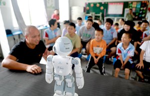 2023年9月20日,四川省华蓥市特殊教育学校的孩子们,在老师的带领下和智能机器人互动。 (周松林摄影报道)