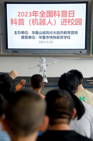 2023年9月20日,四川省华蓥市特殊教育学校的孩子们在体验智能机器人魅力。