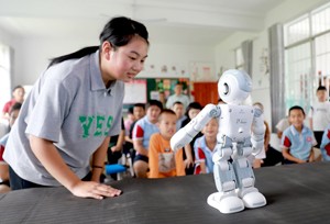 2023年9月20日,四川省华蓥市特殊教育学校的孩子们,在和智能机器人互动。