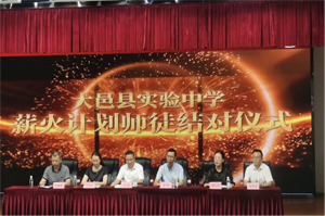 为了推动学校教育高质量发展,打造一支结构合理、思想素质好、业务水平高的教师队伍。2023年9月22日,大邑县实验中学2023-2024学年度“薪火计划”师徒结对仪式在学术厅隆重举行。大邑县教育局中教室主任王成、教育学会书记杨懿、大邑县教师进修学校教务主任何俊杰、梅小红等专家与学校党总支书记李华清、校长张家智等学校领导、学校名优骨干教师、青年教师参加仪式。