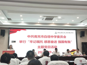 2023年9月18日上午,四川省南充市白塔中学党委在凌云楼101会议室举行“牢记嘱托 感恩奋进 强国有我”主题党日活动,学校全体校级领导、中层干部、离退休支部书记、各支部委员、党小组长、预备党员、主题教育领导小组工作人员等共70余人参加,会议由党委委员、副校长冯涛主持。