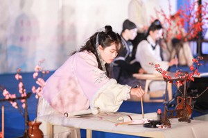 篇章三,冬日雪落后,天色晴好。最宜“负暄赏雪,踏雪寻梅”,去体验一场诗意流淌的雅事。《咏梅》《白梅》《再用前韵》……从前,诗人们用笔墨书写生活中的诗情与画意。而今,塔中师生在吟诵这一首首诗词时,心上竟也欢喜不已。更何况,还有食趣情景剧和画梅雅事,把那落在梅花上、飘进诗词里、下在人们心里的雪赋予无尽的生命力。