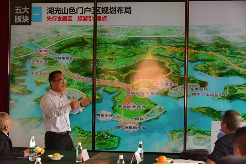 调研组一行,一边乘船实地考察继光湖的现状,一边与县文旅局局长李金勇进行了深入交流。详细了解继光湖的规划设计、项目进展以及生态保护等方面的情况。