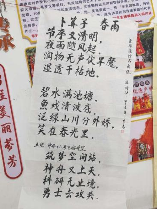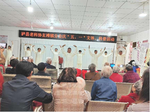 为进一步弘扬劳动光荣,劳动崇高的伟大精神,鼓励老科协会员积极投身经济社会高质量发展建设中,为新时代新质生产力发展贡献力量。泸县老科协玄滩镇分会于4月30日组织会员及文艺爱好者等60余名,在老年学校底楼开展了庆“五一”文体、科普活动,老同志们在大合唱《劳动最光荣》中拉开序幕,营造出热烈的活动氛围,随后太极拳《杨氏二十四》,金钱板《耍哥》、《薅秧歌》等内容丰富多彩,形式多样的精彩节目一一呈现。庆祝活动同时展览了诗词、书法、画画等作品,会员张均仲以春雨“节序又清明,夜雨随风起,润物无声伏旱魔,湿透干枯地。碧水满池塘,鱼戏清波底,泛绿山川分外娇,笑在春光里”的诗句展现活动场内,让大家分享。